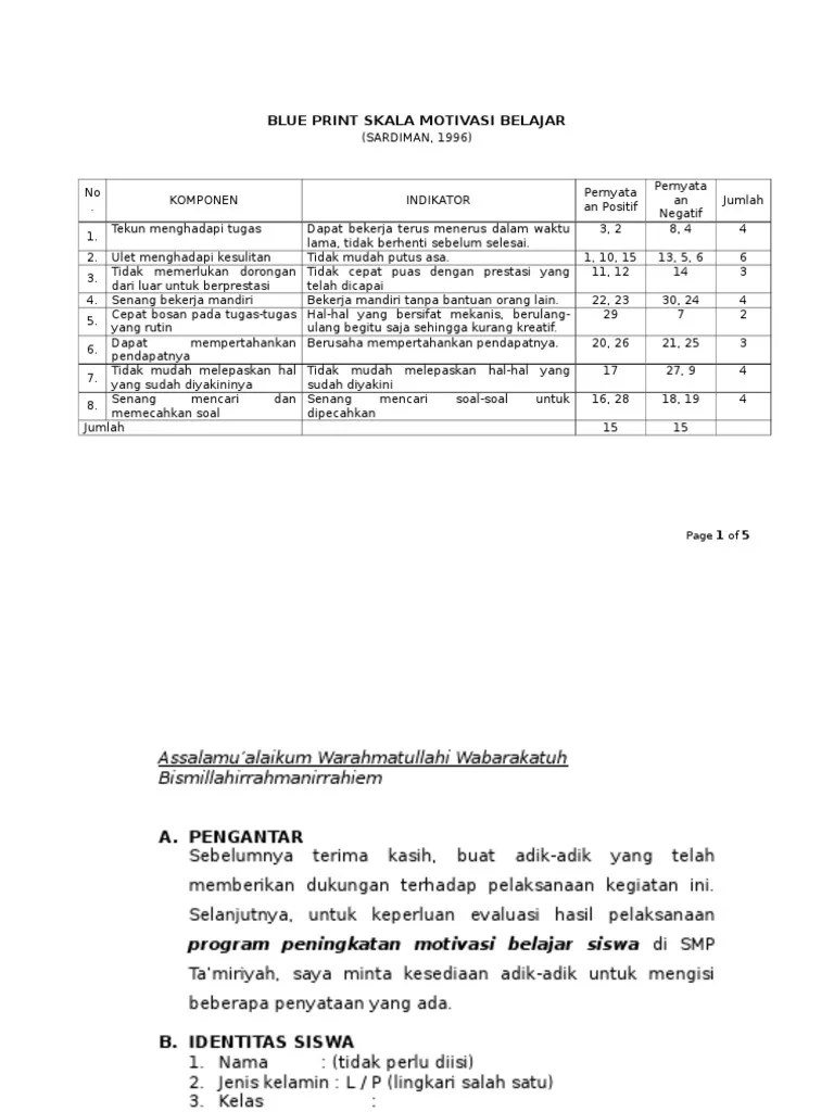 Contoh Kisi Kisi Angket Motivasi Belajar : Kisi Kisi Angket Docx Document - (diadaptasi dari ciri motivasi belajar menurut sardiman, h.. Rubrik penilian kuesioner motivasi belajar siswa. Angket yang diberikan kepada siswa yang terdiri dari 15 pernyataan tentang motivasi peserta didik terkait pengadaan praktikum. (diadaptasi dari ciri motivasi belajar menurut sardiman, h. Bangun ruang dan apa saja contoh bangun ruang yang ada disekitar. Isilah identitas anda terlebih dahulu:.