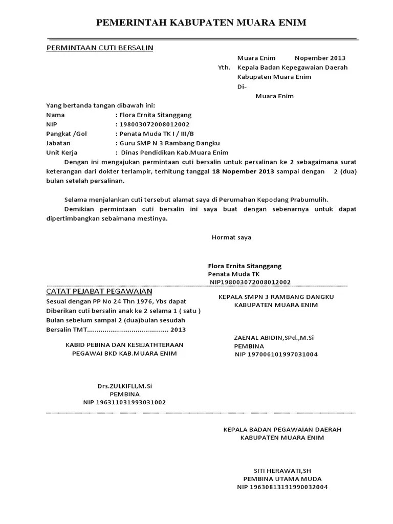 Fotokopi sah surat keputusan pangkat terakhir . Terdapat 2 (dua) contoh surat izin cuti/libur kerja yakni surat cuti kerja karena melahirkan dan surat cuti kerja karena sedang sakit. Cek contoh surat cuti melahirkan bagi guru doc terlengkap. Surat permohonan cuti tanpa gaji urusan peribadi. Fotokopi sah surat keputusan calan pegawai negeri sipil;